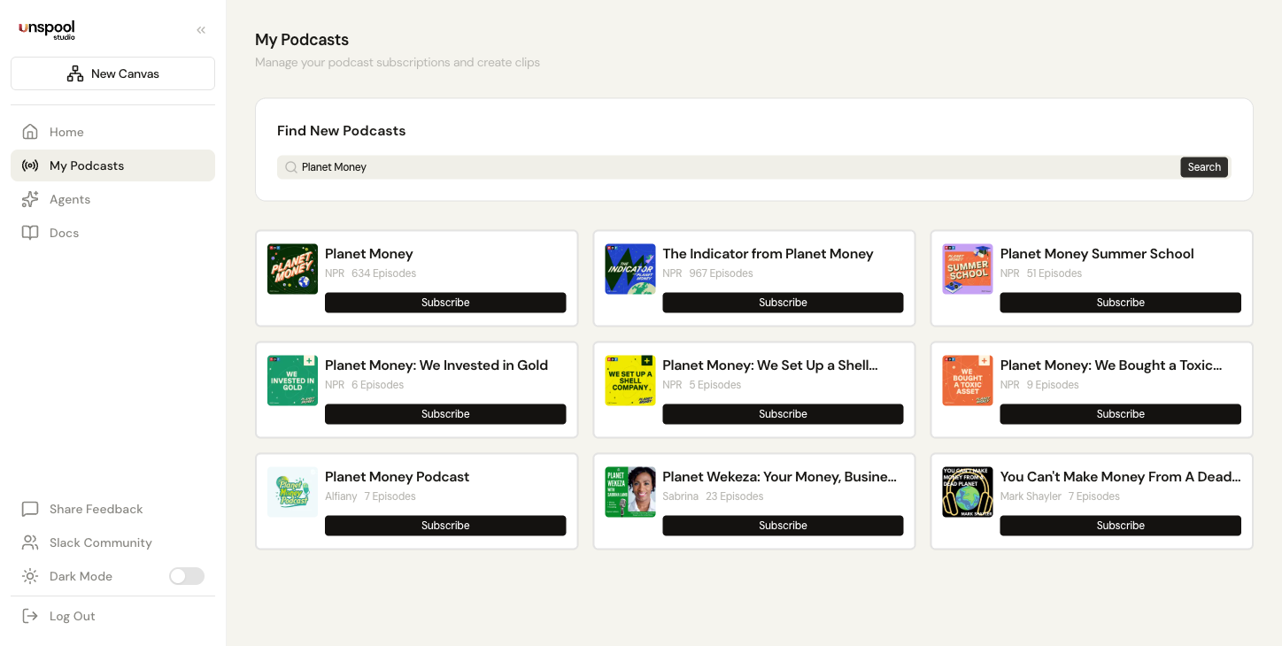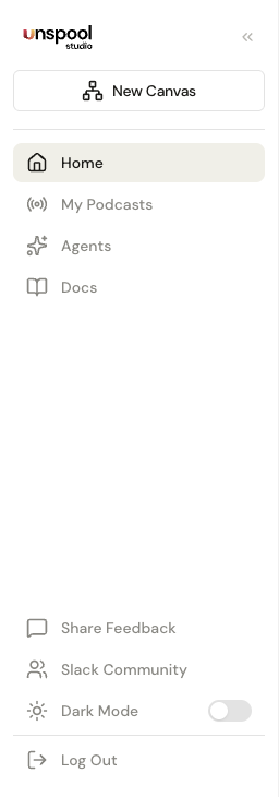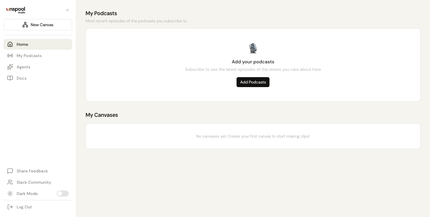 Visit Unspool Studio and create an account or log in. You land on your dashboard — your home base for managing canvases, subscribed podcasts, and the AI Clip Agent. The collapsible sidebar on the left gives you quick access to everything.