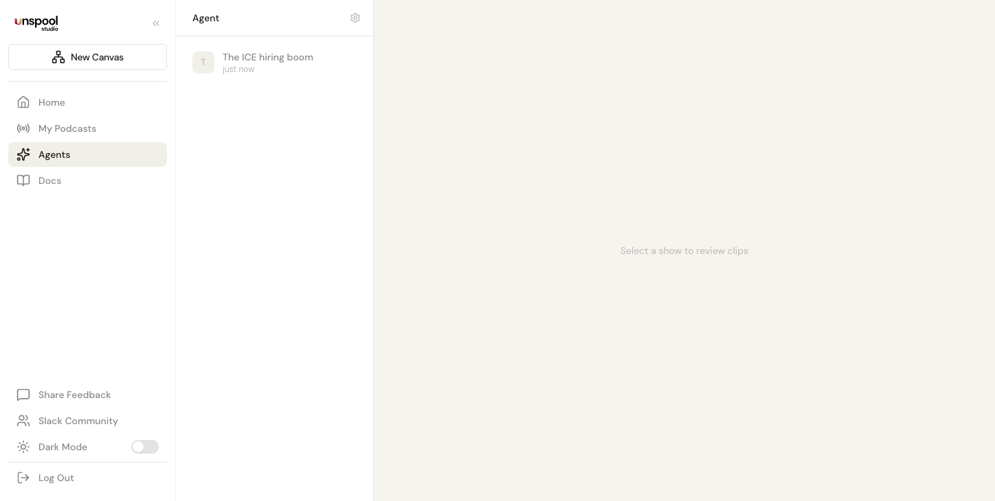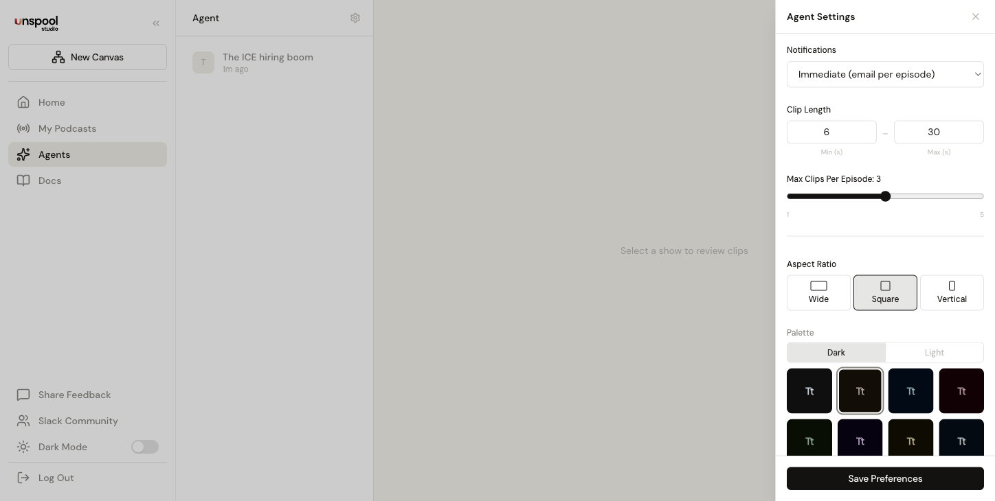 Unspool Studio's AI Clip Agent runs in the background and delivers ready-to-export video clips every time your subscribed podcasts publish new episodes. The agent detects new episodes from RSS feeds, transcribes the audio, identifies speakers, finds the most compelling moments, scores each clip on viral potential, and pre-loads everything into a canvas — all without any action from you. You open the Agent page and start reviewing.