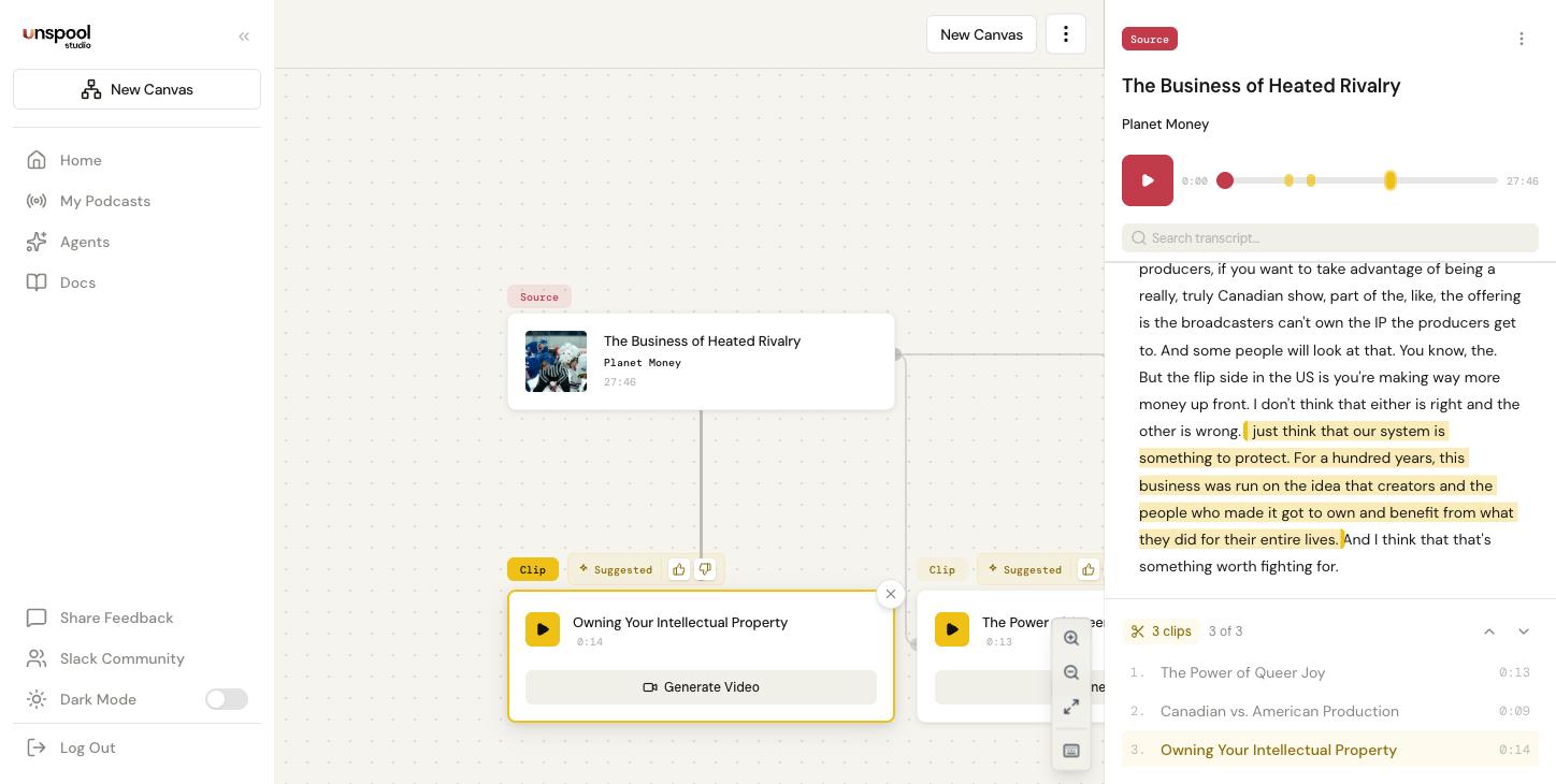 After transcription, the AI analyzes the entire episode and suggests the most shareable moments — strong quotes, key insights, compelling exchanges, and emotional beats. Each suggestion appears as a clip card on the canvas with: