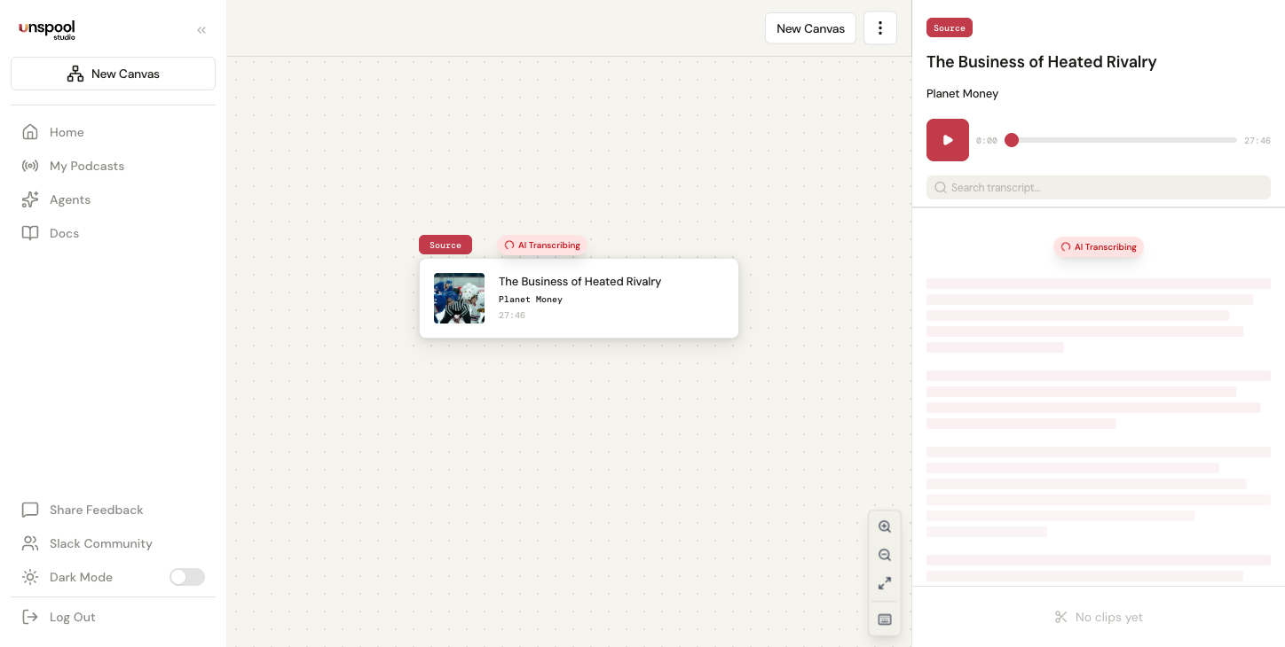 When you add an episode to a canvas, transcription starts automatically. Unspool Studio processes the full audio and delivers a complete, browsable transcript. Here's what happens behind the scenes: