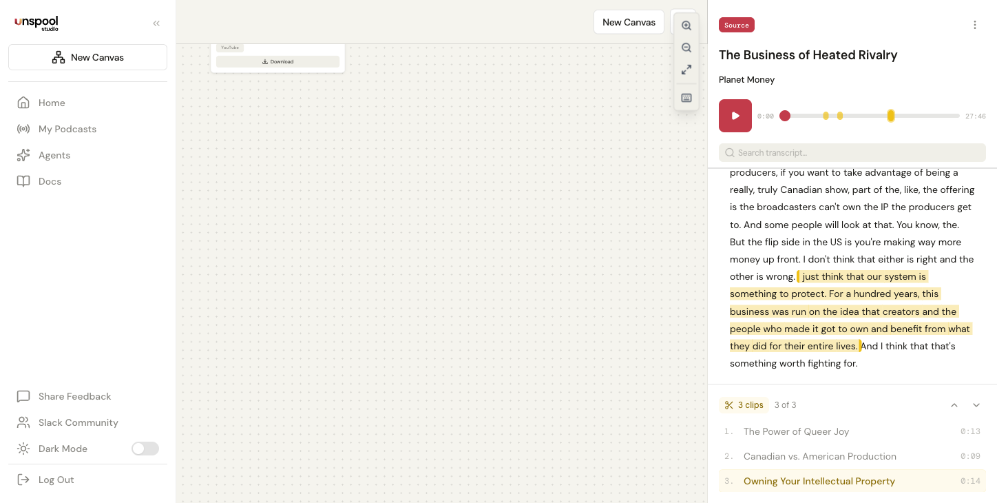 Unspool Studio supports two main export types: video clips with animated subtitles and transcript text. Video is the primary format for social media distribution. Transcript export gives you the text for repurposing across written channels.
